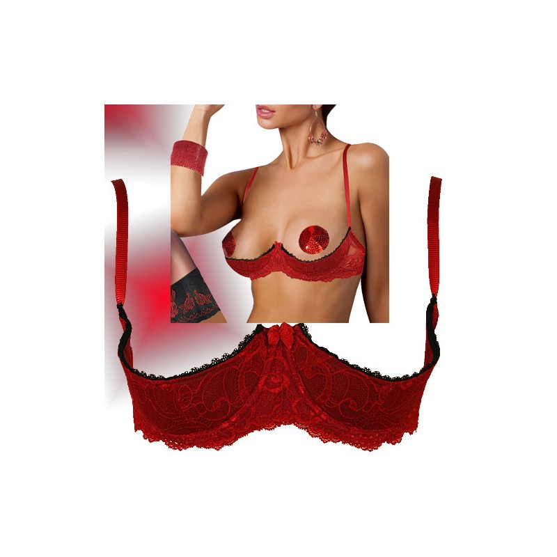 Raffiniertes Büstenhebe-BH Set aus zarter roter Spitze mit aufwendiger Blumenstickerei. Die Cups-Ouvert sind mit Bügeln unterlegt und mit schwarz- oder rotfarbigen Rüschen verziert. Angenehmes Material und hochwertige Verarbeitung. Passender String-Ouvert wird mitgeliefert. Edler Look mit sinnlischer Erotik!